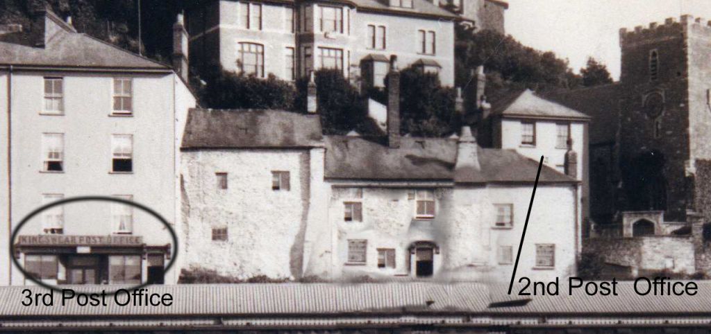 The first post office, with Thomas Avis, was on the corner of the sea wall at the south-west of our Kingswear’s First Post Office ferry slip, in Longford beyond the telephone box. There were steps there too, later used by Tom Casey for a passenger ferry.