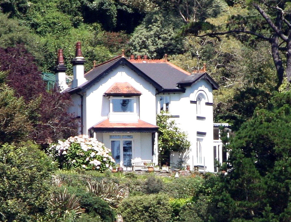 Dartmouth slate was quarried from beside the lane nearby to construct Start Bay Villa’s two foot thick stone walls whose thermal insulating property beats any modern cavity wall hollow. Initially probably just three bedrooms, it was enlarged around 1880, and had further extensions added in the 1920s. At some stage black painted mock Tudor timbers were added to the white painted walls; these were removed in 1987. The slate roof is graced with a number of decorated terracotta finials, a grand dragon over its porch, and a griffin with ball in beak above the dining room. As with so many Kingswear houses built on a steep slope, all three floors have an external door. The extensive lower round floor, originally the kitchen and servants quarters, has now reverted to more menial basement purposes (laundry, workshop, garden store etc, with still room enough for a billiard table). An outer hall, dining room, and lean-to sun room were added during the last century. Apart from modernisation and some internal rearrangements, there have been no recent major additions.