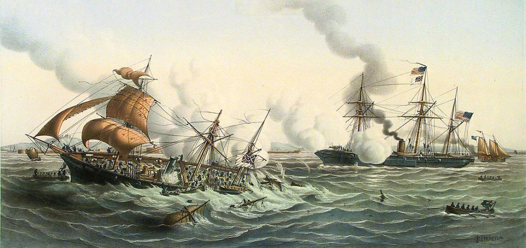 The sinking CSS Alabama in the foreground, USS Kearsarge behind and Deerhound in the background