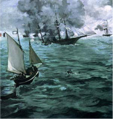 After about an hour’s bombardment, with several men killed and many others wounded, Alabama was beginning to sink. Among the injured was Captain Semmes, who turned his ship and tried to run back towards Cherbourg. However, when Kearsarge headed him off and the rising water stopped his engines, Semmes struck his flag. As Alabama sank, some twenty minutes after firing ceased, most of her crew were rescued by the victor and by the British yacht Deerhound. Those saved by the latter, including Semmes and most of his officers, were taken to England and thus escaped capture and imprisonment much to the annoyance of US authorities. While Kearsarge had been slow to send boats to rescue the men in the water, Deerhound had acted promptly and Captain Semmes later reported: ‘Fortunately, Edouard Manet’s painting of the battle however, the steam yacht Deerhound, owned by a gentleman of Lancashire, England (Mr. John Lancaster), who was himself on board, steamed up in the midst of my drowning men and rescued a number of both officers and men from the water. I was fortunate enough myself thus to escape to the shelter of the neutral flag, together with about forty others, all told. About this time the Kearsarge sent one and then, tardily, another boat.’