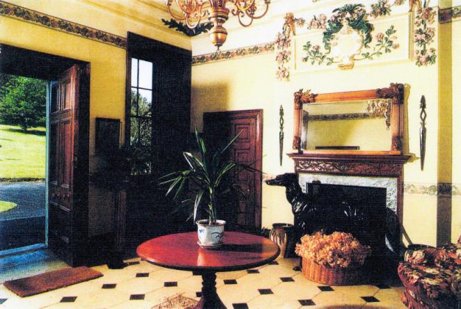 The ground at the front was raised a little, thus ‘swallowing’ some of the steps leading up to the front door; then there was a raising of the ground level at the side of the house facing the drive on approach. This meant that the bottom storey of four was completely buried, so that now the house appears to be only three storeys, the old bricked-up windows of the original kitchen, servants’ quarters, etc. are now in the cellar. At the back of the house a built-up walkway was added which gave the house a terrace, previously lacking. Round about 1978 the roof was re-formed; this was done by simply building a new single-pitch roof over the old twin-pitch one.