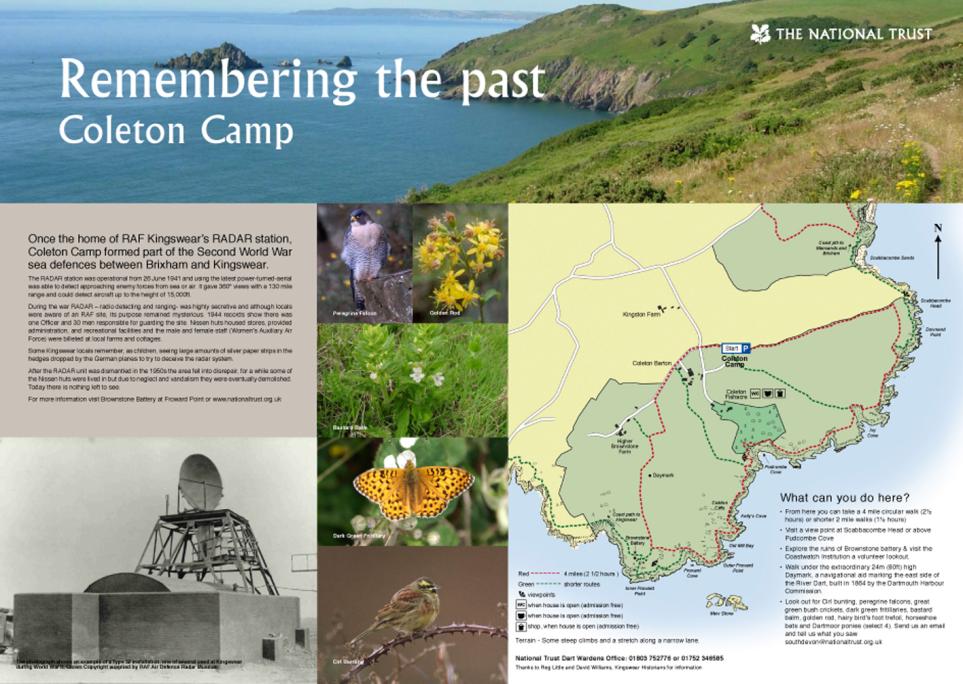 The National Trust car park at Coleton Camp was the site of this important radar station during WW2. Because of the fear of an invasion it provided the eyes and ears for early detection of this and any threat of enemy action. The attached information board will encourage folks to enjoy the current delights of our coastline as well as indicating how a radar site functioned.