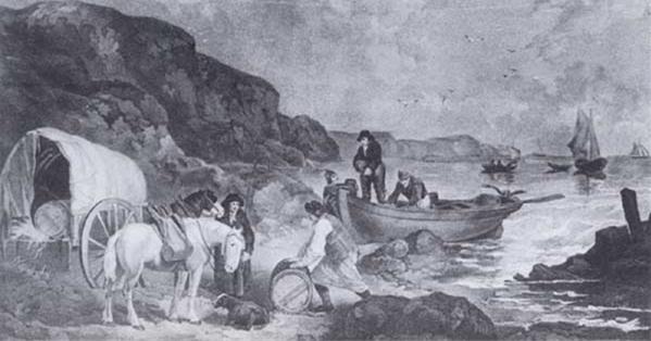 Custom duties date back to the time of the Magna Carta when the King, by Royal Prerogative, regulated all the commercial activities in his realm. Later sovereigns, including Edward I, passed statues controlling the goods subject to duties and the amounts to be levied. Over the centuries a bureaucracy developed which by 1678 had produced a customs establishment in each port. At Dartmouth there were a collector, surveyor, two waiters and searchers and four boatmen. In addition Brixham, Salcombe and Torquay each had a waiter and searcher, making a total of eleven. The imposition of these duties, and the consequent desire of local seafaring men to avoid paying them, led to the development of smuggling. It was after the Smuggling Act of 1736, when it became a crime to import certain items that the trade really took off. The high cliffs and sheltered coves of Devon made it an ideal landing place and soon many hundreds seafarers and landsmen took part in bringing ashore cargoes of wine and spirits; there are also records of large quantities of tea and tobacco being landed. Money attracted these smugglers in to what could be a dangerous occupation as many ships were wrecked and lives lost, but the rewards were great, with a cargo being worth anything from £2,000 to £10,000 – a far cry from the pay for working on the land of £20 per annum.