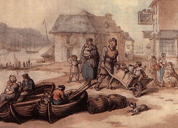 This picture, ‘The Pot Mender’, was painted by Thomas Girton about 1799. He died aged 22 years. The beach is that between the car ferry slip and Collins slip by the Yacht Club (from where the first passenger ferries ran). The chap with the barrow is the itinerant pot- mender – an important tradesman at that time. The building behind him in the distance is the Plume of Feathers, now the Royal Dart Hotel, before its third storey was added. The building with hanging sign this side of the Ferry slip is where our Post Office is now – with a good deal of artistic licence!