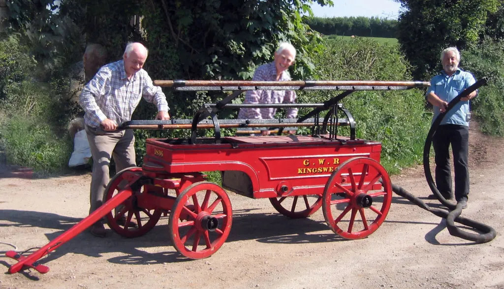 In an adventure reminiscent . of the Last of the Summer Wine, three Historians went to London Lambeth Fire Station to re-claim and return the 171 year old Fire ‘Engine’ to Kingswear. Pulled by the firemen and manually pumped, it latterly sat on Kingswear Station. Its ‘home’ before the arrival of the station is unknown, but from 1855 it was kept in a shed on the station.