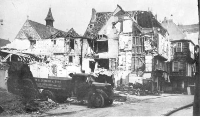 One Saturday morning in 1943 at about 11 am, I was in Lower Contour Road, planes approached and several explosions ensued. Being in the First Aid Party at the time although only aged 15, I went down to Mr Fairweather’s garage where we kept a Commer Brake ambulance, which had two stretchers, which we had recently been allocated. Mr Charles Bovey (not the station master) was in charge of the First Aid Party. We went immediately to Dartmouth where the bombs had fallen on the Town Arms and the Bank in Duke Street.