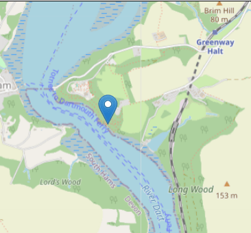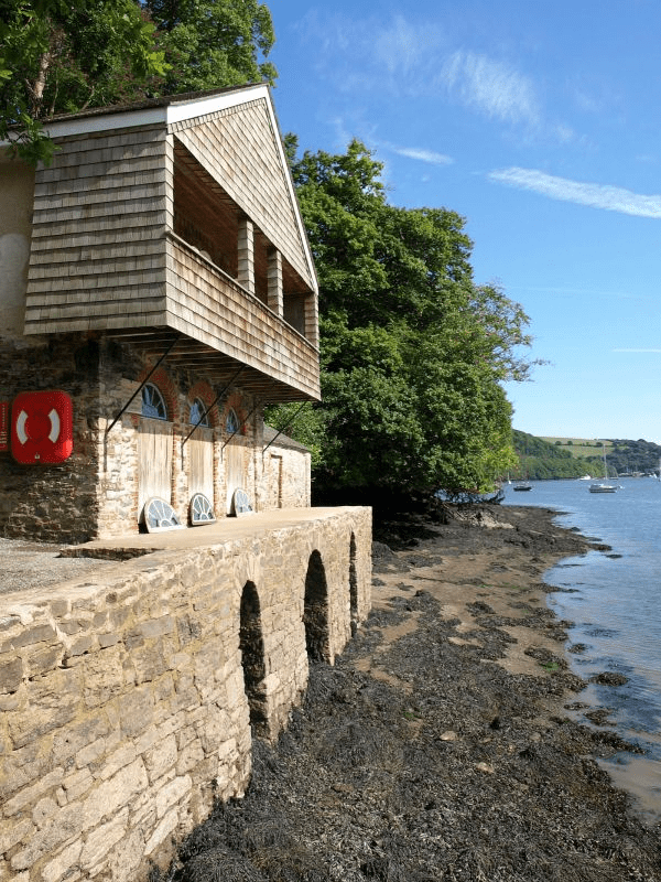 Bathhouse and adjoining boathouse to Greenway House qv. Late C18 or early C19. Slate rubble, partly plastered. Originally thatched but now with shingle roof with singled gable facing river. Two storeys. First floor jettied with balcony and three round-arched windows. Ground floor three round brick arched openings. Built over stone basement at beach level with round-headed sluices which allow sea water to enter bath at high tide. Interior: Sunken bath with iron balustrade and steps down. Small chimneypiece to fireplace on rear wall. Room above with balcony overlooking River Dart. Small stone rubble boathouse adjoining south east.