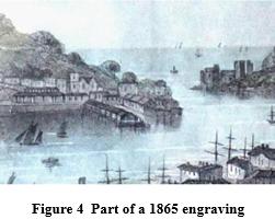 | It is probable that the top of the tower had sight of the river entrance and able to give an early warning of an invasion. The engraving by George Townsend, dating from about 1865, part of which is shown in figure 4, suggests that the tower would have had good view of the river mouth. Today the view is interrupted by houses and the raised level of Church Hill, evidenced by the retaining wall on the side facing the river. Beyond the road the ground falls rapidly to the river. |
