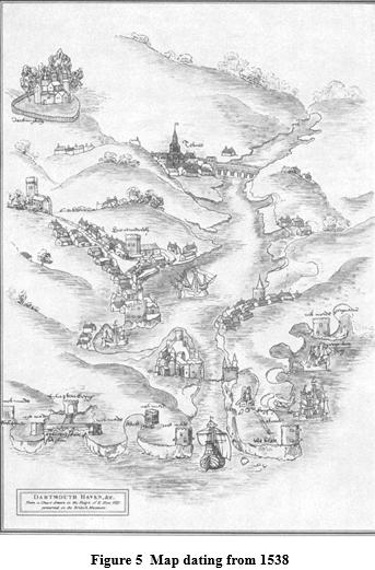 | In 1538, some 350 years after the church was built, a map was commissioned by Henry VIII showing the defences in the south-west, figure 5. Many of the towers shown on the map are labelled “not made”. Kingswear church tower is shown with a spire would have made it more visible from the sea and aided the location of the entrance to Dartmouth harbour. There is no other record such a fixture was ever on the tower. |