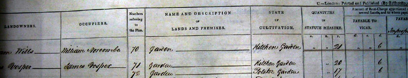 There are ongoing records of owners (see below); e.g. in 1841 Mr Wm Wills was landowner of plot 70, cultivated by Wm Norcombe as a kitchen garden of 20 perches; plots 71 and 72, of 21 and 17 perches, were owned and cultivated by James Vosper, 71 as a kitchen garden, and 72 as a potato garden. By 1881 the three gardens had been purchased and combined to form the plot for the vicarage.