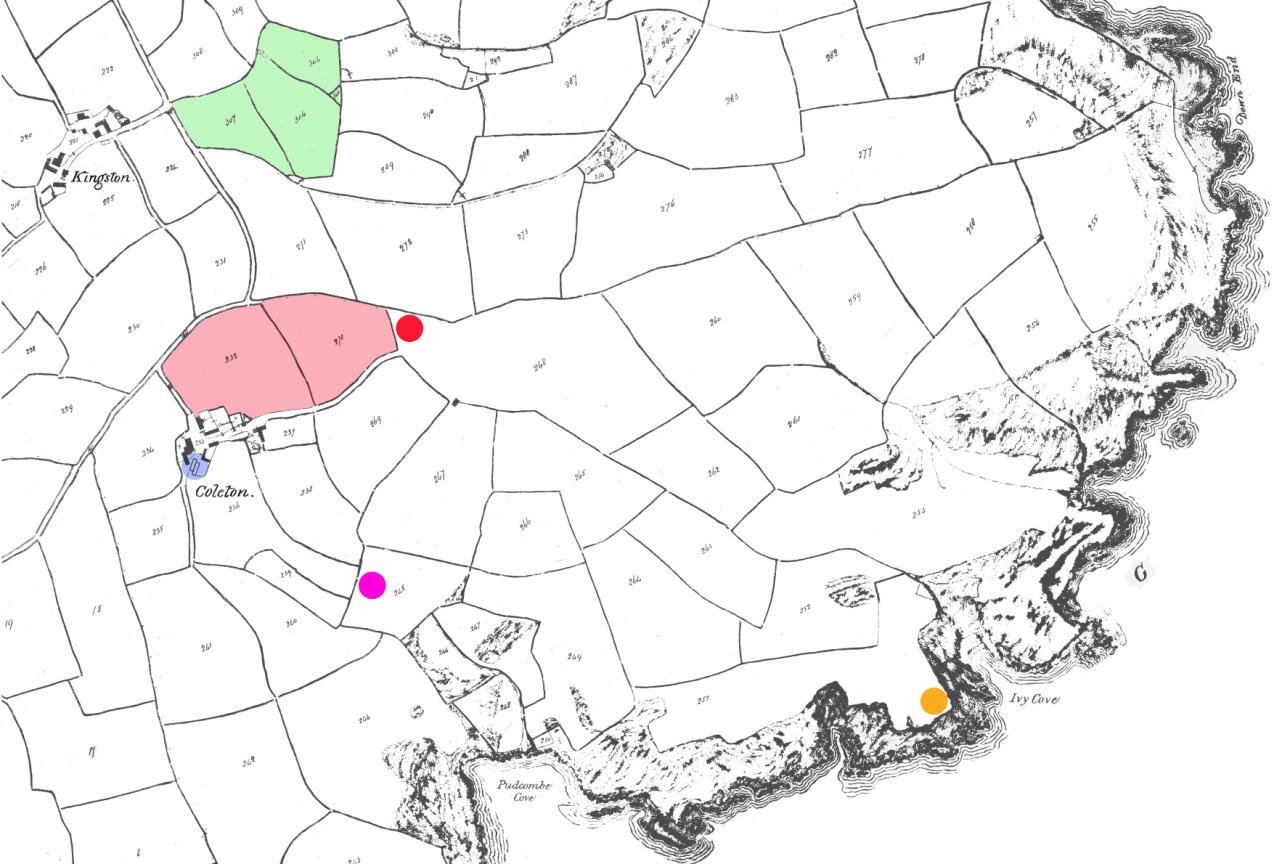 The fields marked in green in figure 1 are listed on the tithe map of 1838 as Higher Church Park, Middle Church Park and Meadow (left to right). They are feoffees (held in trust) to St Mary’s Church in Brixham and do not appear to be associated with the chapel at Coleton. The two fields near to Coleton, shown pink, are named as Lower Chapel Park and Upper Chapel Park. It was the custom to endow chapels with land and that is presumably what these two fields are. Following the dissolution of the monasteries by Henry VIII in 1524 and the Chantry Act of 1547 this land and any associated chapel would have been sold into private hands. The chapel fields were included in the Fownes-Luttrell sale of Coleton Farm in 1874 while the church fields were listed as Church Land on the sale map and not available for purchase from him.