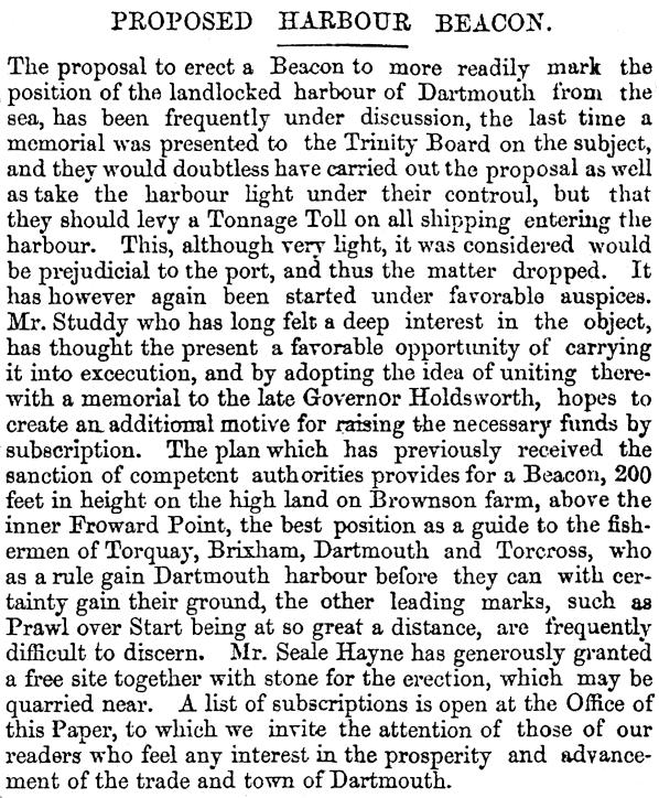 Trinity Chapel was clearly used as a landmark for shipping and presumably at some time it fell into disrepair and was no longer sufficiently visible from the sea. A letter to the Dartmouth Chronicle in June 1855 proposed the erection of a tower to mark the entrance to the river Dart in memory of the late Sir Robert Newman who had died in the Crimean war. In February 1861 a firm proposal was tabled, figure 15, this time to be as a memorial to Governor Holdsworth. Land for the beacon, half a mile south of the site of Trinity Chapel, was given by Seale Hayne and a fund was established to pay for it. However there is no discovered record of the beacon being specifically to replace the tower of Trinity Chapel.