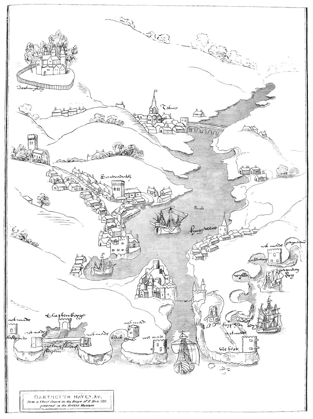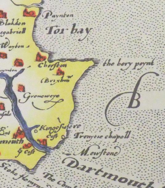 The castle on the east side of the river is Kingswear Castle which still exists. A ruined tower is shown south of the castle. However the map in not a very accurate representation of the local geography and the tower could be the same tower as in the other maps which place the tower to the east of Kingswear. The fact that the tower is shown at all on these three maps indicates that the tower was of maritime importance as few roads, if any, are shown.