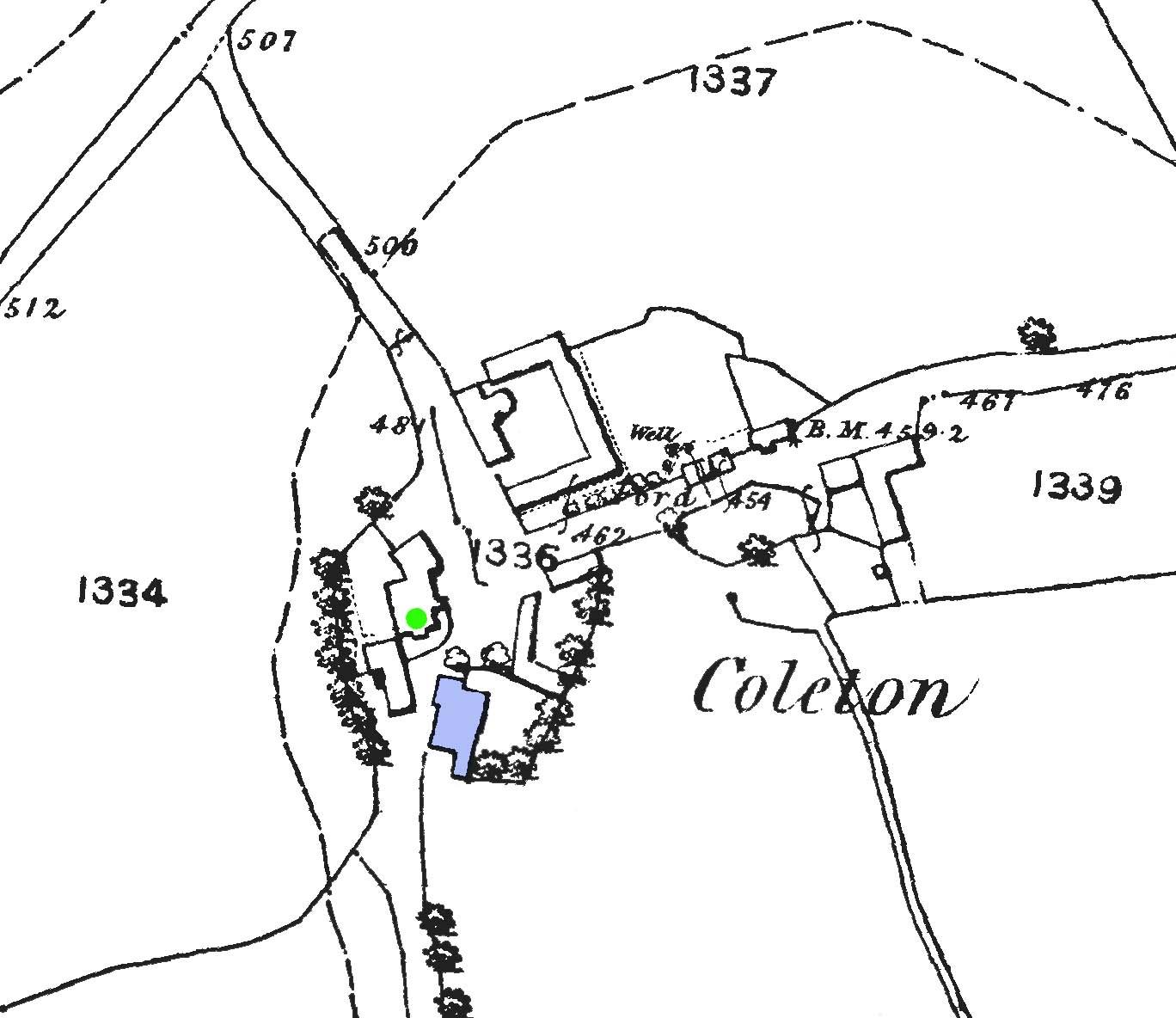 The Ordnance Survey produced a map in 1864 although this was not published until 1880. This map, part of which is in figure 6, shows the buildings at Coleton perhaps a little more accurately than the tithe map of 1838. The probable site of the chapel is marked in blue.