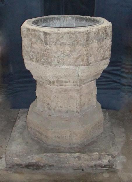 Kingswear’s church of St Thomas of Canterbury contains a font, figure 7, which is very weathered as if it had been kept outdoors for a considerable time. Beatrix Cresswell12 reported that “The font is octagonal, of Purbeck marble, having shields on the panels. It is much battered, and has suffered badly from weathering, having been used for many years as an ornamental garden vase”. Another version13 holds that it was found in a pig sty at Boohay (which is less than a quarter of a mile east of Nethway House). This belief also maintains that the font was originally in Trinity Chapel. Possibly the font was moved to the chapel at Nethway following the possible closing of Trinity Chapel at Coleton.