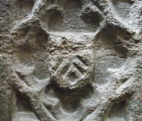 The top section is separate from the base, is slightly less weathered and contains a flat bottomed vertical sided lead bowl. One face is not sculptured and its flat surface still shows signs of the fine finish which is possible with Purbeck marble and which made it so popular as a material for church stonework. On only one face is there a reasonably clear image which appears to be two chevrons with possibly a lion passant above, figure 8. This side is one position to the left of the front of the font, assuming that the un-sculptured face is the back. So this coat of arms may not be that of the donor of the font but of an overlord or local religious leader. Figure 8 Coat of arms on the font