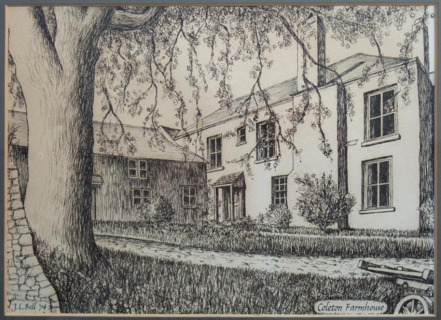 Figure 10 shows the old Coleton Farmhouse as sketched in 1974. The building was badly damaged at this time and the artist would have interpreted how it had looked in better days. Mr Sheppard knew the old farm house when he was head gardener at the estate from 1953. The old building had very thick walls, with slits as windows. He also recalls there being a curved staircase up to a small room which he knew as a priest’s prayer room.