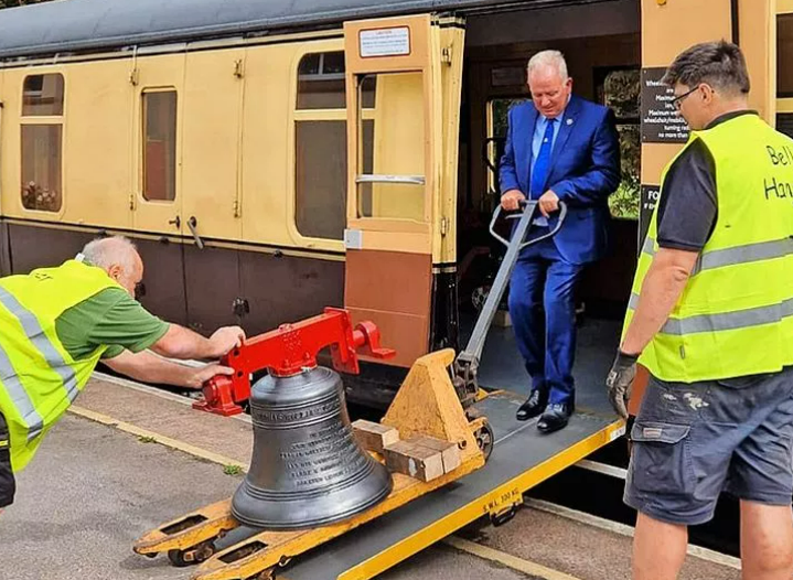 The new bells arrived at Kingswear Train Station from the Taylors Bell Foundry by steam train on Sunday 15th September 2024 at 2.35pm and were welcomed by villagers, officials. They were also welcomed by a and a peal of bells from Dartmouth’s St Saviour’s Church as the train pulled into Kingswear Station. They were on display at St Thomas of Canterbury Church for two days until they were installed in the bell tower.