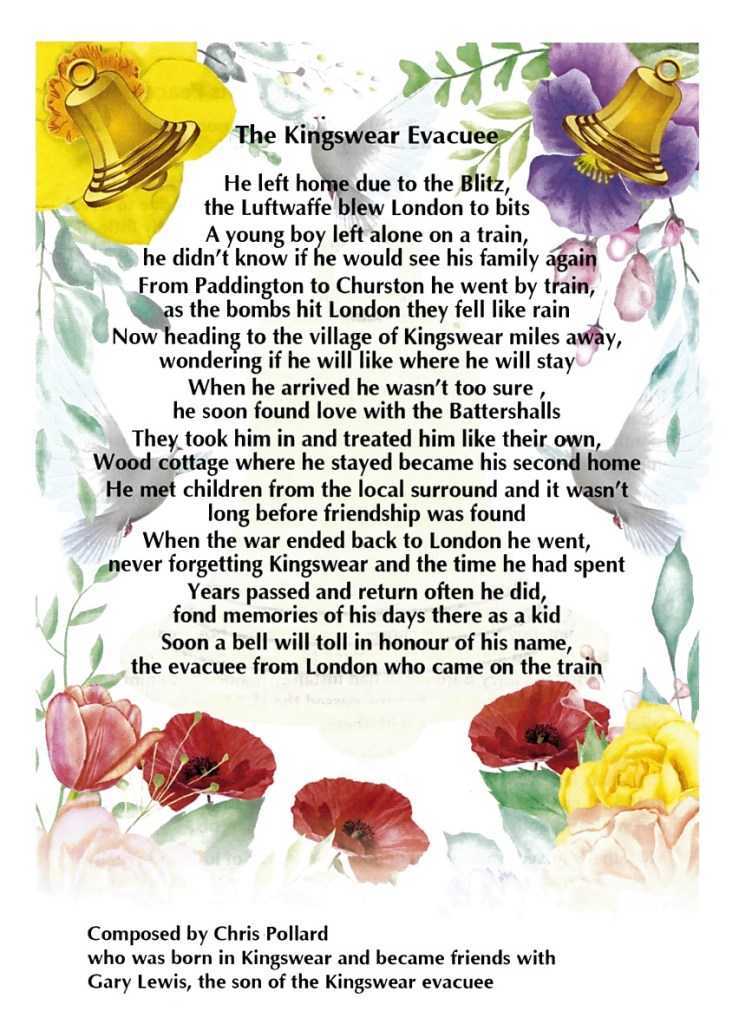 Through the generosity of the Lewis family of Kingswear they were able to buy the 3rd bell – The Thomas William Lewis Peace Bell which is dedicated to the memory of Second World War Kingswear evacuee Thomas William Lewis. His story, and an associated poem, can be viewed through this LINK.