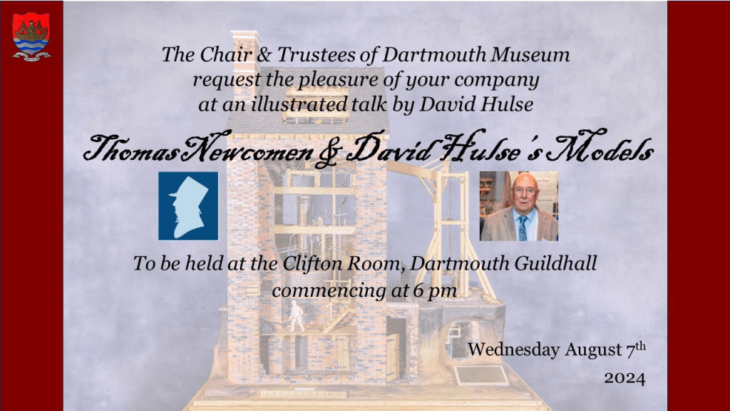 David’s talk will be from 6-7pm at the Clifton Room, in the Guildhall, Victoria Road, after which he will be happy to answer questions and talk about his model making, Newcomen and Dartmouth. It is free and we hope that as many Dartmouth residents as possible will come to show their appreciation of David’s work and his most generous donations.